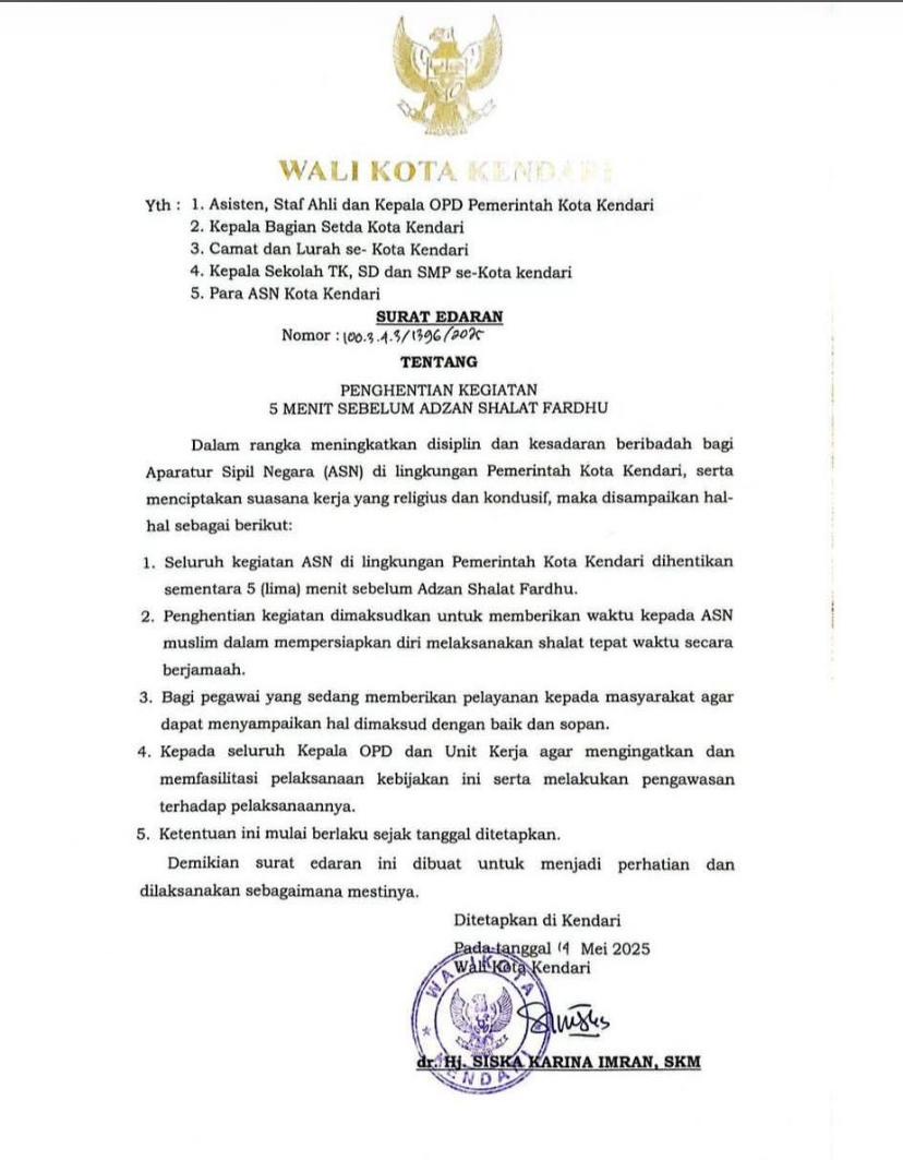 Kendari, Sultrademo.co — Pemerintah Kota Kendari resmi mengeluarkan Surat Edaran (SE) tentang penghentian kegiatan kerja selama 5 menit sebelum adzan shalat fardhu berkumandang.