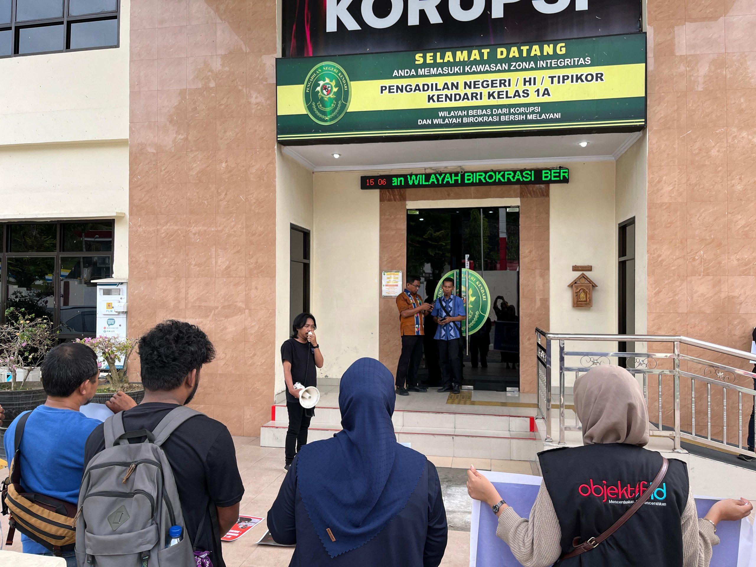 Kendari, Sultrademo.co – Aliansi Jurnalis Independen (AJI) Kendari, Komite Keselamatan Jurnalis (KKJ) Sulawesi Tenggara (Sultra), IJTI Sultra, dan LPM IAIN Kendari berunjukrasa di depan Kantor Pengadilan Negeri (PN) Kendari, Kamis (6/11/2025).