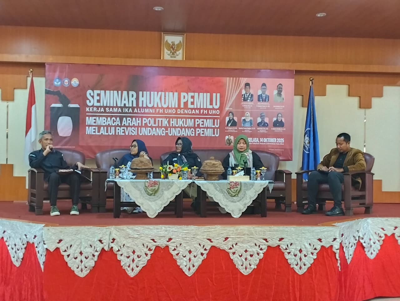 Kegiatan ini menghadirkan empat narasumber, yakni Ketua KPU Sulawesi Tenggara, Suprihaty Prawaty Nengtias, Ketua Bawaslu Sultra, Iwan Rompo, Akademisi FH UHO, Sahrina, S.H., M.H., dan Akademisi FH Universitas Indonesia, Dr. Titi Anggraini. Seminar tersebut diikuti oleh mahasiswa, dosen, serta alumni Fakultas Hukum.