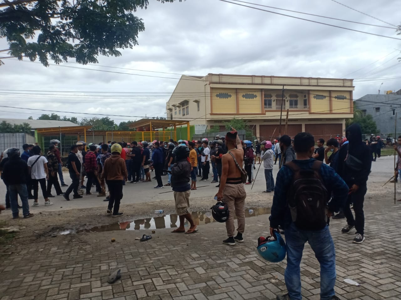 Saat ini, ratusan demonstran masih memadati jalan pertigaan sebelum hotel Claro, hingga perempatan Hotel Athaya.
