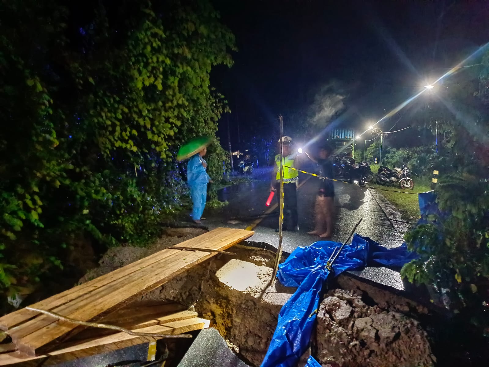 Selain membangun jembatan darurat, petugas bersama warga juga membersihkan ranting pohon yang tumbang akibat angin kencang di sekitar lokasi. Meski demikian, Reflian mengimbau para pengendara agar tetap berhati-hati saat melewati area tersebut.