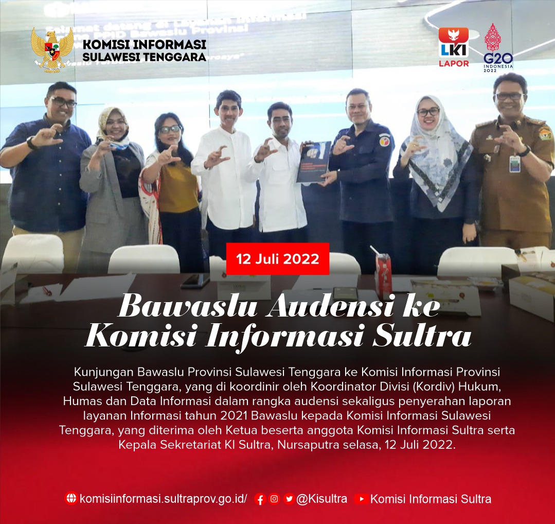 Kendari, Sulatrademo.co – Bawaslu Provinsi Sulawesi Tenggara melakukan kunjungan ke Komisi Informasi Provinsi Sulawesi Tenggara, dikoordinir oleh Koordinator Divisi (Kordiv) Hukum, Humas dan Data Informasi dalam rangka audensi sekaligus penyerahan laporan layanan Informasi tahun 2021 Bawaslu kepada Komisi Informasi Sulawesi Tenggara, yang diterima oleh Ketua beserta anggota Komisi Informasi Sultra serta Kepala Sekretariat KI Sultra, Nursaputra selasa, 12 Juli 2022.