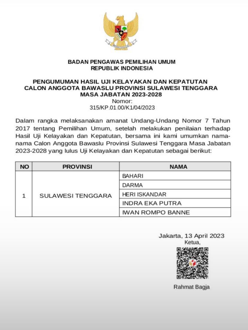 Penetapan itu tertuang dalam Surat Bawaslu RI dengan nomor: 315/KP.01.00/K1/04/2023 yang ditanda tangani langsung oleh Ketua Bawaslu RI Rahmat Bagja.