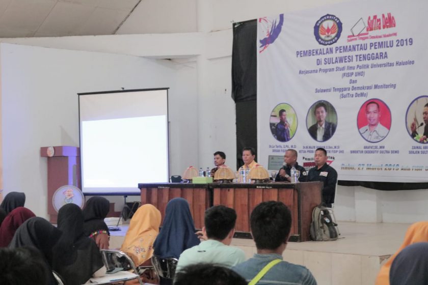 Kendari, (SultraDemoNews) – Fakultas Ilmu Sosial dan Ilmu Politik bersama Lembaga Pemantau Sulawesi Tenggara Demokrasi Monitoring (SULTRADEMO) menggelar pembekalan pemantauan pemilu kepada mahasiswa di Aula Lakilaponto, Fakultas Ilmu Sosial dan Politik Universitas Halu Oleo (FISIP UHO), Rabu (27/3/2019).