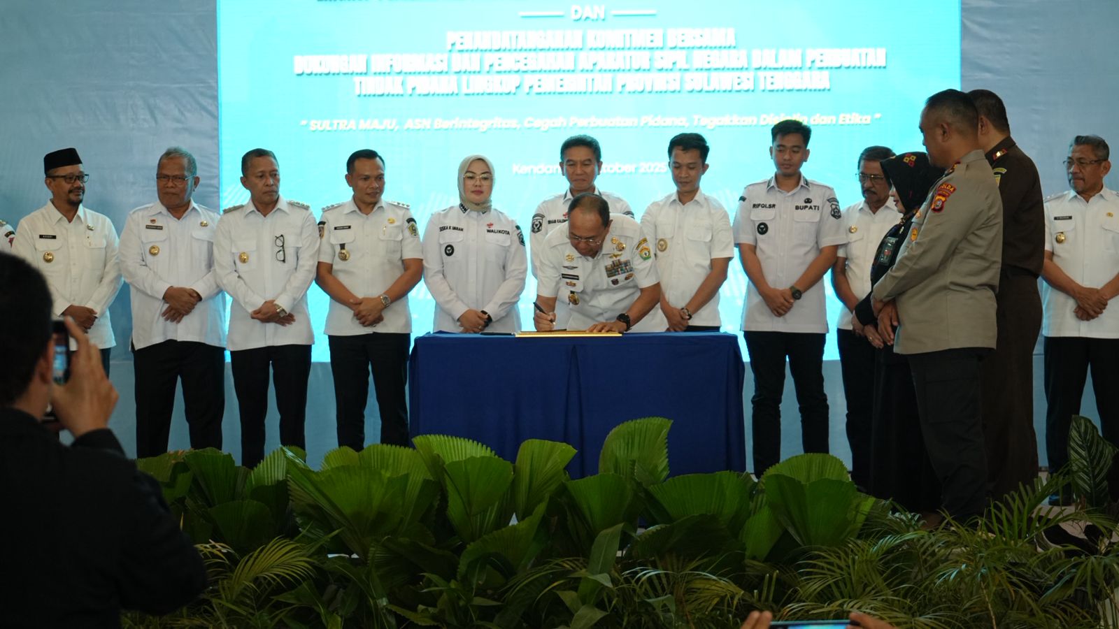 Konawe, Sultrademo.co – Bupati Konawe, Yusran Akbar, ST., bersama 16 kepala daerah lainnya di Sulawesi Tenggara (Sultra) menandatangani Pakta Integritas Komitmen Bersama Dukungan Informasi dan Pencegahan ASN dalam Perbuatan Tindak Pidana, Rabu (8/10/2025).