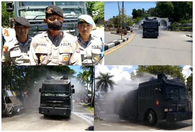 “Pada kegiatan penyemprotan cairan desinfektan dengan menggunakan kendaraan taktis AWC (Armor Water Canon) di mulai dengan menyemprotkan cairan desinfektan di seputaran Asrama Polres Kolaka yang kemudian kegiatan dilanjutkan dengan melakukan penyemprotan cairan desinfektan di seputaran wilayah Kecamatan Kolaka. Kegiatan penyemprotan cairan desinfektan merupakan salah satu langkah dari jajaran Polres Kolaka dalam rangka pencegahan Virus Corona atau Covid-19″ Ungkap IPTU Muh. Djafar.