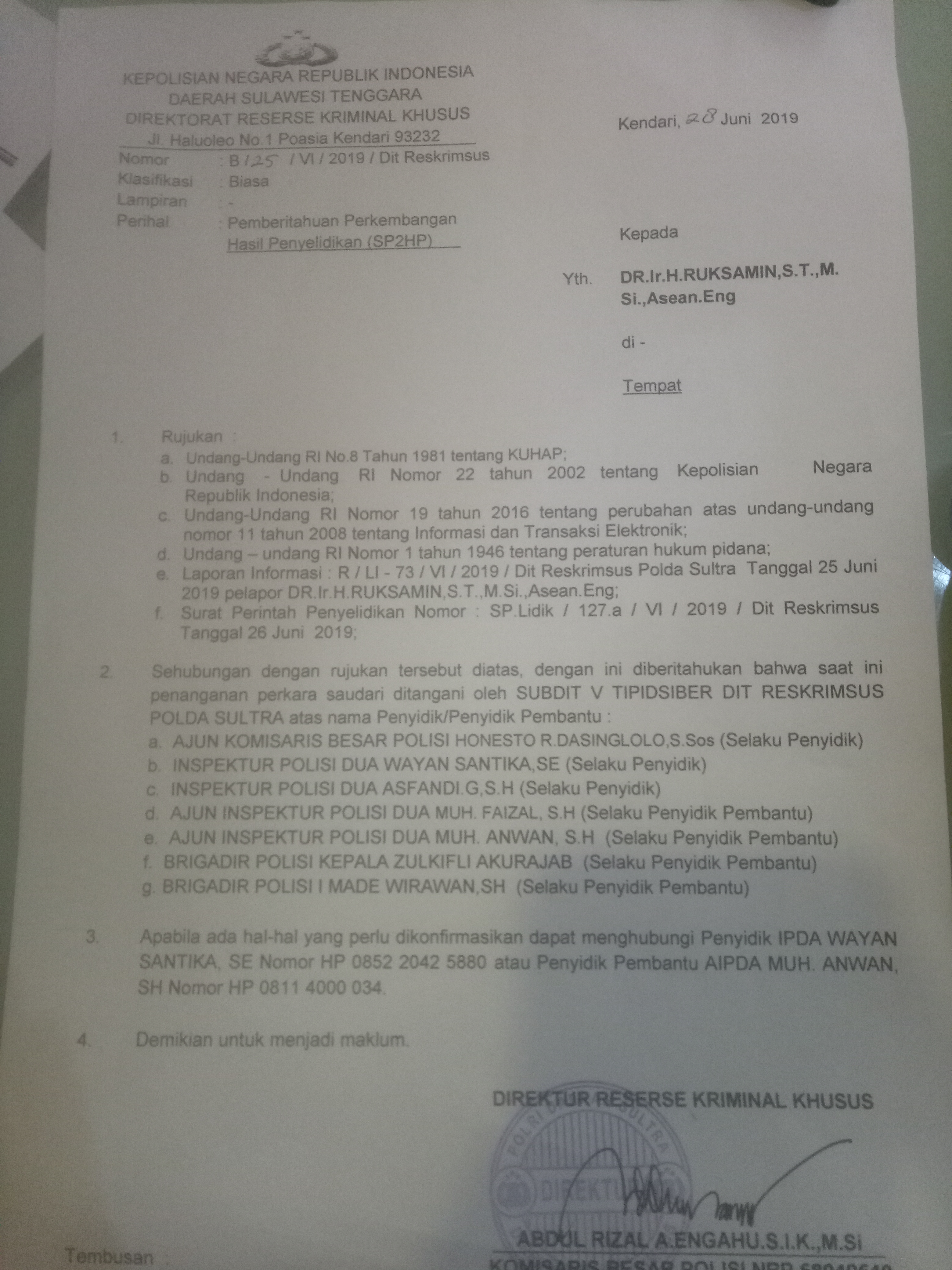 “Saat ini perkara saudara ditangani oleh Subdit V Tipidsiber Dit Reskrimsus Polda Sultra atas nama penyidik/penyidik pembantu, Ajun Komisaris Besar Polisi, Honesto R. Dasinglolo (selaku penyidik), Inspektur Polisi Dua, Wayan Santika (penyidik), Inspektur Polisi Dua, Asfandi (penyidik), Ajun Inspektur Polisi Dua, Muh. Faizal (penyidik pembantu), Ajun Inspektur Polisi Dua, Muh. Anwan (penyidik pembantu), Brigadir Polisi Kepala, Zulkifli Akurajab (penyidik pembantu) dan Brigadir Polisi, Imade Wirawan (penyidik pembantu),” demikian bunyi surat SP2HP yang dikeluarkan pada 28 Juni 2019.