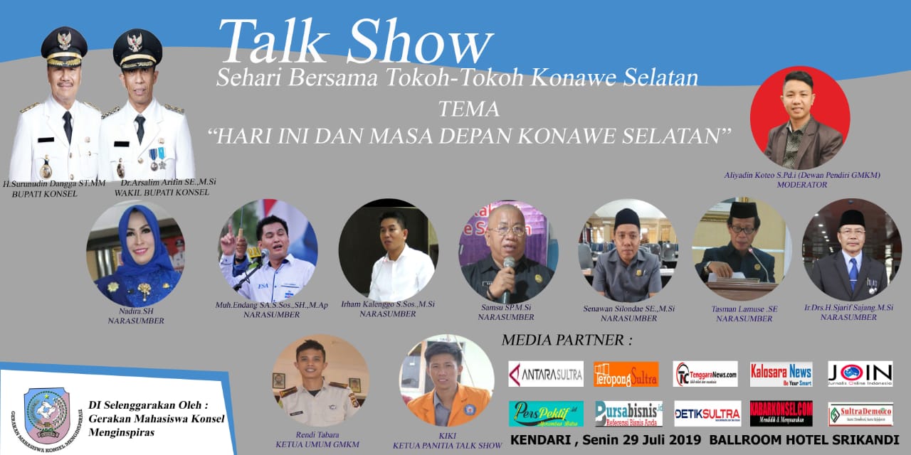Hal itu disampaikan Ketua Panitia Talk Show, Kiki Ikram saat menggelar Konferensi Pers. Dikatakannya, beberapa tokoh-tokoh Konsel yang bakal hadir antara lain, Bupati Konsel, Surunuddin (dalam tahap konfirmasi), Arsalim (Wakil Bupati Konsel), Sjarif Sajang (Sekda Konsel) Irham Kalenggo, (Ketua DPRD Konsel), Muh Endang (Ketua DPD Demokrat Sultra), Senawan Silondae (Anggota Dewan/Ketua DPC PDIP Konsel), Nadira (Anggota Dewan/Ketua PAN Konsel), Tasman Lamuse (Anggota Dewan/Ketua NasDem Konsel) dan Samsu (Anggota Dewan).