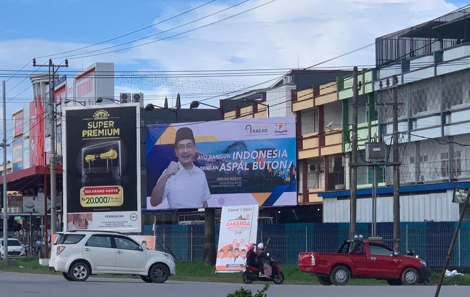 Dalam media tersebut, Arsjad yang mengenakan kemeja putih dan berkopiah hitam terlihat mengepalkan tangan, tanda memberikan dukungan. “Ayo bangun Indonesia dengan aspal Buton,” kata Arsjad dalam billboard tersebut.
