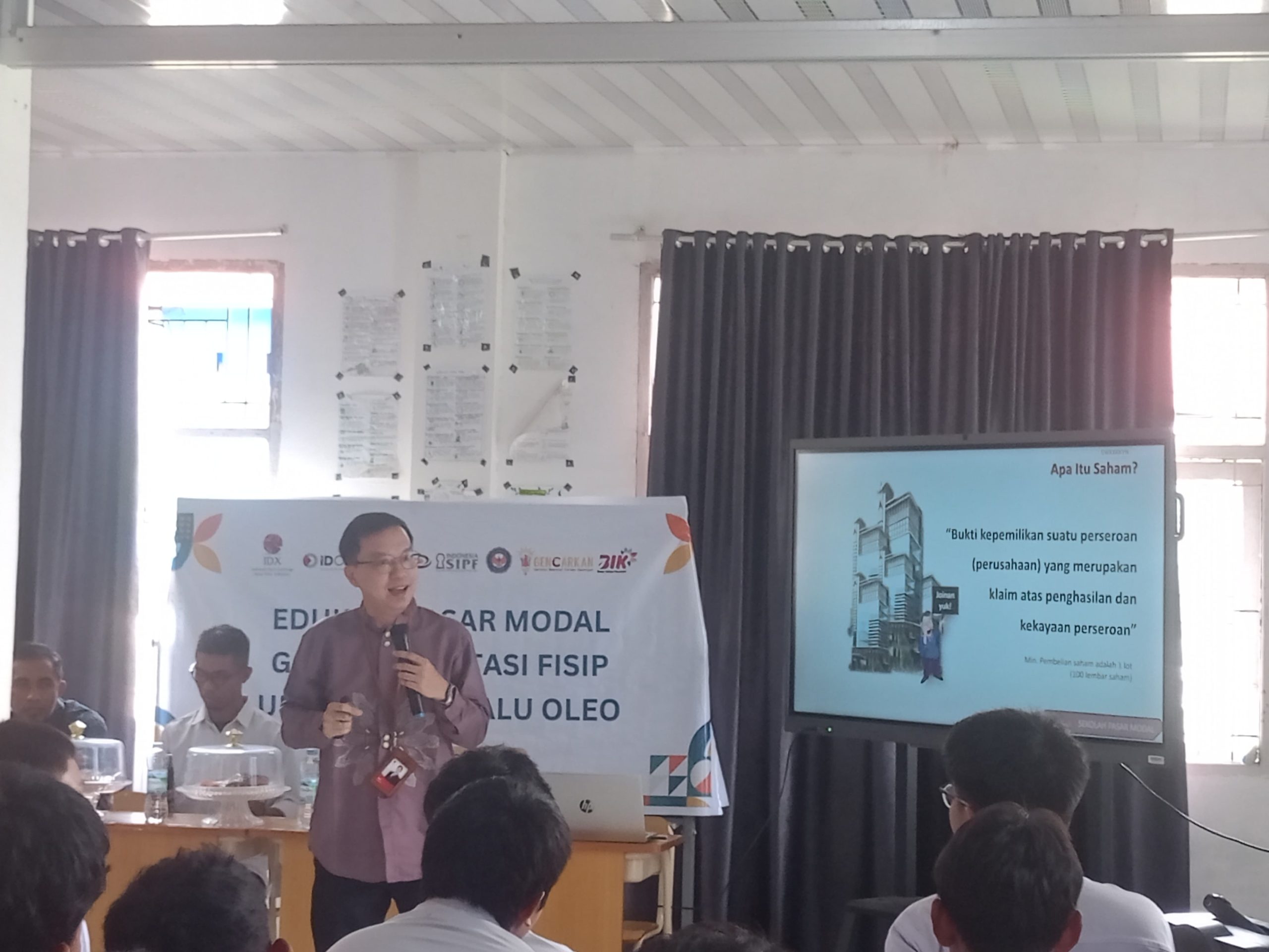 Kegiatan tersebut menghadirkan narasumber dari IDX Wilayah Sulawesi Tenggara (Sultra), Ricky, S.E., M.M., CFP, yang menjelaskan pentingnya memahami berbagai instrumen investasi, seperti saham, reksa dana, dan obligasi.