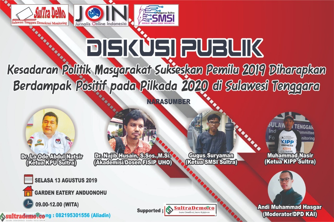 Kendari, Sultrademo.co – Usai Pemilu 2019, dan Menjelang Pilkada Serentak 2020 mendatang, Sultra Demo bekerja sama dengan Serikat Media Siber Indonesia (SMSI) Sultra dan Organisasi Jurnalis Online Indonesia (JOIN) Kendari bakal gelar diskusi publik yang akan dilaksanakan pada 13 Agustus mendatang.