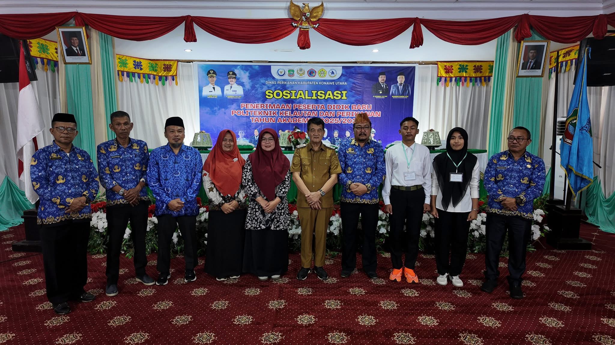 Dalam sambutannya, Wakil Bupati Abuhaera menyampaikan rasa syukur dan apresiasi yang tinggi atas terselenggaranya kegiatan sosialisasi ini. Ia menegaskan bahwa kehadiran Politeknik KP merupakan peluang emas bagi generasi muda Konut untuk meningkatkan kompetensi diri.