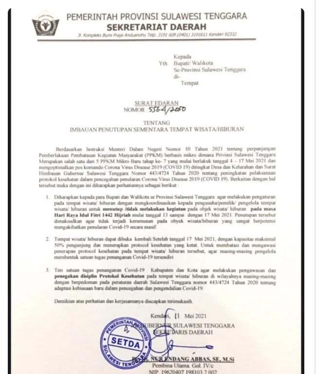 Sebelumnya Gubernur Sultra sempat mengeluarkan keputusan untuk menutup semua tempat wisata yang ada di Sultra. Surat edaran tersebut bernomor 5564/2050 dilayangkan kepada wali kota dan bupati se-Sultra, tertanggal Selasa (11/5/2021).