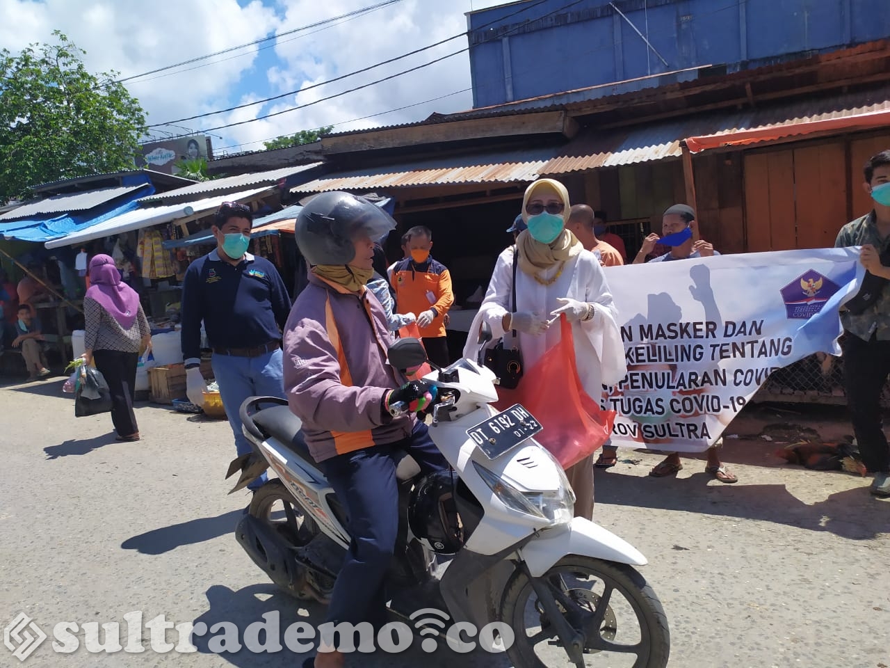 Kendari, Sultrademo.co – Untuk memutus mata rantai penyebaran Corona virus desease 2019 (Covid-19), Tim Gugus Tugas Percepatan Penanganan Covid-19 Provinsi Sulawesi Tenggara (Sultra) membagikan masker kepada masyarakat, di Pasar Mandonga samping Makorem 143/Haluoleo Kendari, Jumat (17/4/2020).