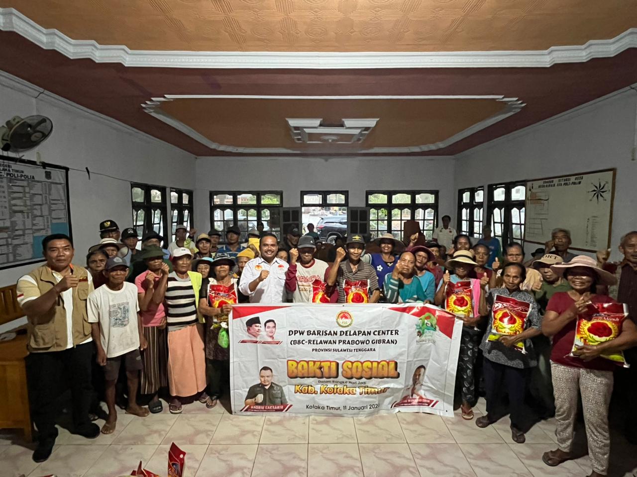 Kolaka Timur — Dalam rangka memperingati Hari Ulang Tahun (HUT) Kabupaten Kolaka Timur ke-13, DPW Barisan Delapan Center (B8C) Provinsi Sulawesi Tenggara melaksanakan kegiatan bakti sosial berupa pembagian beras gratis kepada masyarakat. Kegiatan tersebut berlangsung di Desa Wia-Wia, Kecamatan Poli-Polia, Kabupaten Kolaka Timur.