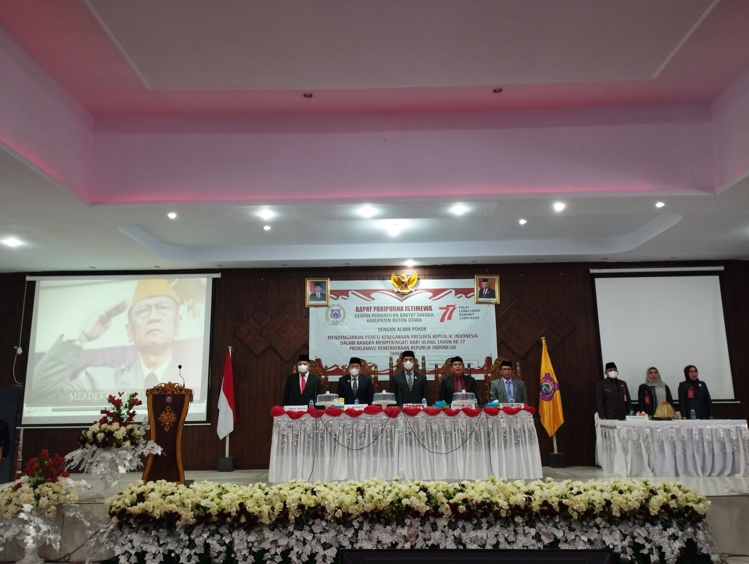 “Kemerdekaan Indonesia atas segala Jasa-Jasa pengabdian kepada Bangsa dan Negara. Selanjutnya ia menyampaikan ucapan terimakasih dan penghargaan yang setinggi-tingginya kepada anggota DPRD Kabupaten Buton Utara atas kebersamaan selama ini dalam membangun Negeri tercinta Buton Utara,”