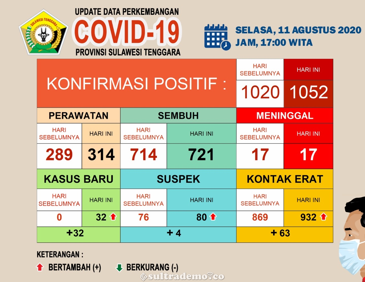 Juru bicara gugus tugas Covid-19, dr. La Ode Rabiul awal mengatakan,untuk Sultra terkonfirmasi saat ini sebanyak 1.052 dengan kasus baru positif Covid-19 sebanyak 32 orang.
