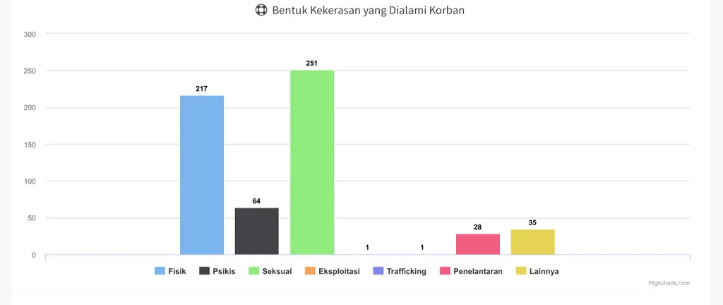Mayoritas kasus kekerasan yang tercatat merupakan kekerasan seksual, dengan korban terbanyak berasal dari kelompok usia anak. Dalam beberapa kasus, korban bahkan masih berusia di bawah delapan tahun dan berasal dari keluarga kurang mampu.