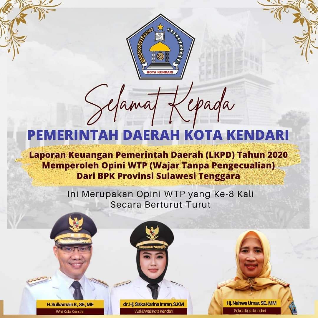 Wali Kota Kendari, Sulkarnain Kadir secara langsung menerima Laporan Hasil Pemeriksaan (LHP) Laporan Keuangan Pemerintah Daerah (LKPD) Kota Kendari TA 2020, yang diserahkan langsung oleh Kepala BPK Perwakilan Provinsi Sulawesi Tenggara (Sultra) Andi Sonny di Aula BPK Sultra.