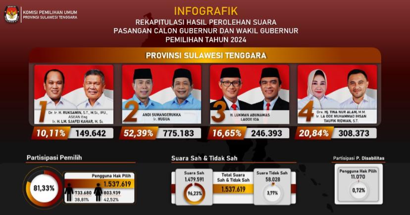 Rapat pleno yang digelar di salah satu hotel di Kendari tersebut menegaskan kemenangan pasangan nomor urut 2, Andi Sumangerukka dan Hugua, dengan perolehan suara sebanyak 775.183 atau 52,39 persen.