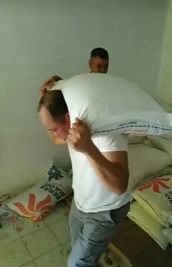 Ketgam, Bupati Konawe Utara, Ruksamin saat menjunjung sekarung beras untuk didistribusi.