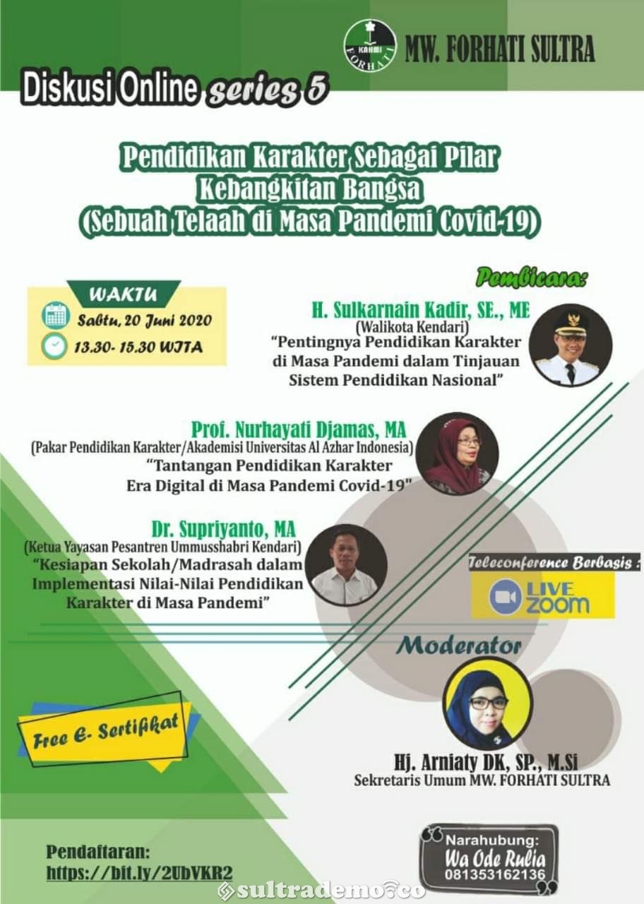 Majelis Wilayah Forhati Sultra menjawab tantangan tersebut dengan menggelar Diskusi Dariing dengan tema “Pendidikan Karakter sebagai Pilar Kebangkitan Bangsa (Sebuah Telaah di Masa Pandemi Covid-19)”