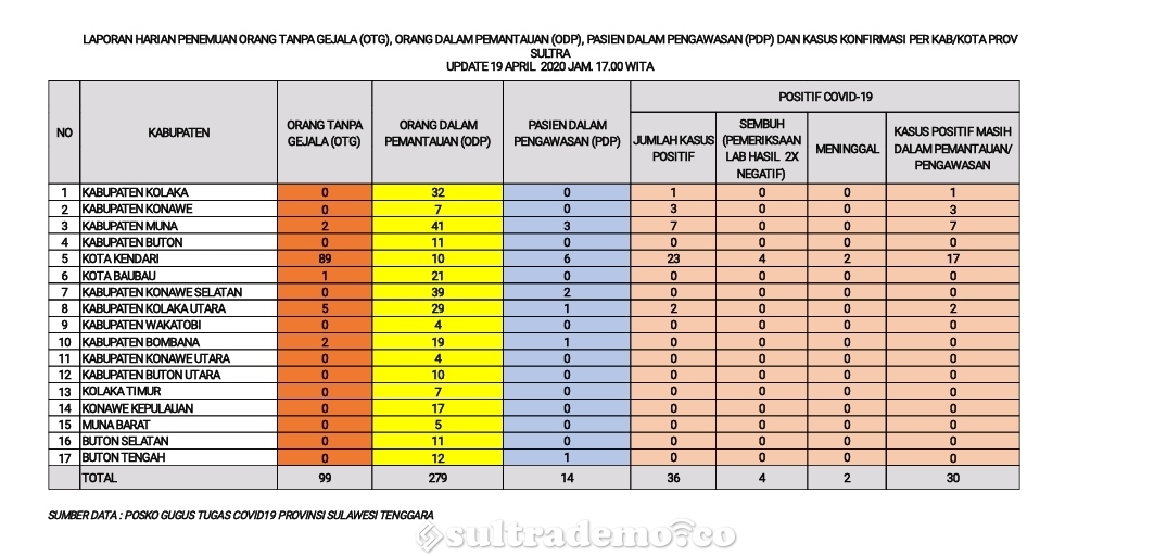 Kendari, Sultrademo.co – Tim Gugus Tugas Provinsi Sulawesi tenggara (Sultra) kembali mengupdate laporan harian penemuan Orang Tanpa Gejala (OTG), Orang Dalam Pemantauan (ODP), Pasien Dalam Pemantauan (PDP) dan Positif Corona virus desease 2019 (Covid-19) Per Kabupaten/Kota Provinsi Sulawesi Tenggara, Minggu (19/4/2020).