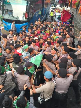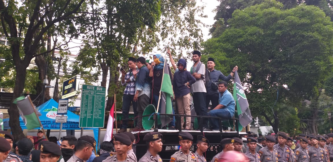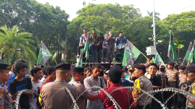 Jakarta – Ratusan mahasiswa yang tergabung dalam Pengurus Besar Himpunan Mahasiswa Islam (PB HMI) melakukan aksi demonstrasi di Kantor Komisi Pemilihan Umum (KPU) RI, Jalan Imam Bonjol, Menteng, Jakarta Pusat, Jum’at (17/5).
