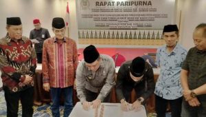 Konawe Utara, SultraDemo.co – Bupati Konawe Utara (Konut), Sulawesi Tenggara (Sultra), Ruksamin bersama Ketua Dewan Perwakilan Rakyat Daerah (DPRD) Konut, Ikbar menggelar, penandatanganan persetujuan bersama antara Pemda dengan Dewan DPRD Konut atas Raperda perubahan Anggaran Pendapatan dan Belanja Daerah (APBD) Kabupaten Konawe Utara (Konut) tahun anggaran 2023.