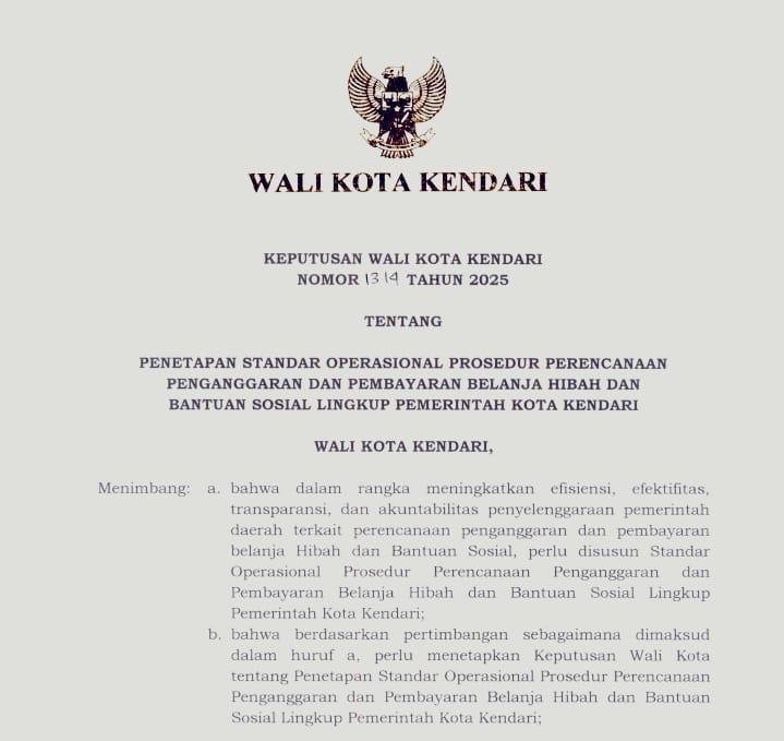 Informasi selengkapnya dapat dilihat melalui link https://berita.kendarikota.go.id/wp-content/uploads/2025/10/SK.-WALI-KOTA-KENDARI-NOMOR-1314-TAHUN-2025-TENTANG-PENETAPAN-SOP-PERENCANAAN-DAN-PENGANGGARAN-DAN-PEMBAYARAN-BELANJA-HIBAH-DAN-BANSOS-LINGKUP-PEMERINTAH-KOTA-KENDARI-1.pdf