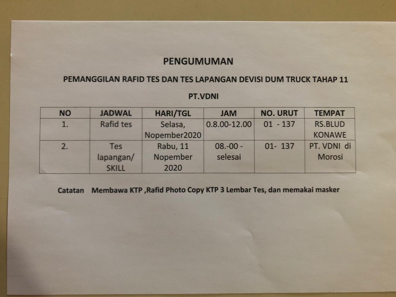 Konawe, sultrademo.co – Berikut Pengumuman pemanggilan Rapid Test Divisi Dump Truck Tahap 11 PT VDNI, Selasa 10 November 2020 di RS Blud Konawe Pukul 08.00-12.00 dan Tes Lapangan Rabu 11 November 2020 di PT VDNI Morosi Pukul 08:00- Selesai.