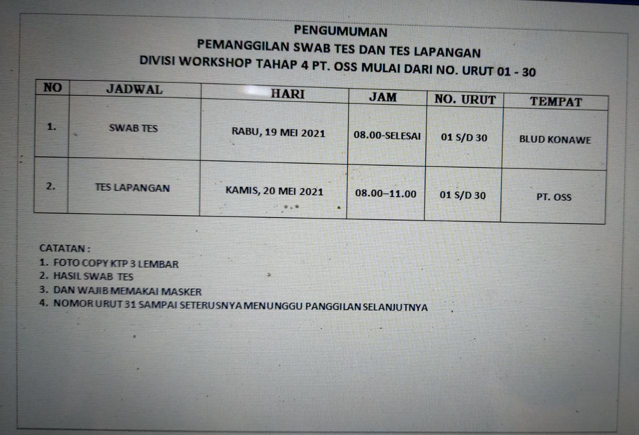 Berikut pengumuman pemanggilan swab test dan tes lapangan calon tenaga kerja PT OSS :