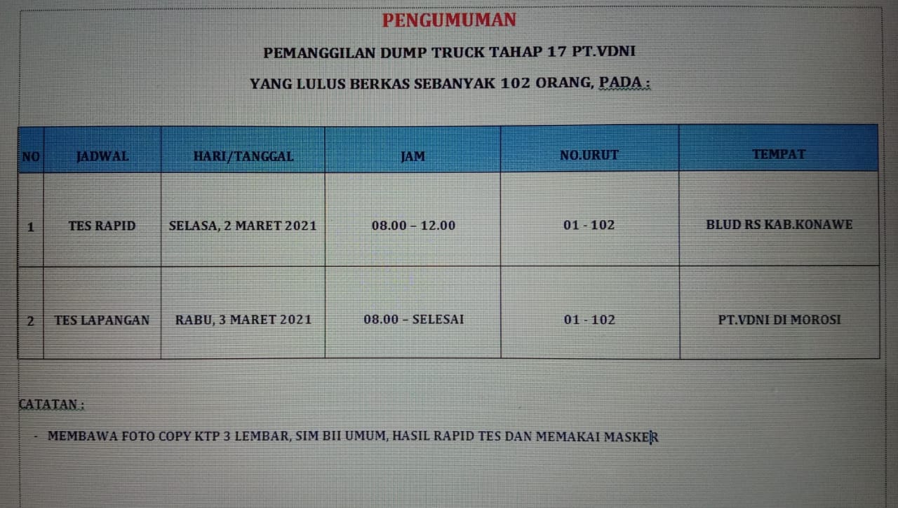 Kendari, sultrademo.co – Berikut Pengumuman Pemanggilan Tes Rapid dan Lapangan Dump Truck Tahap 17 PT. VDNI.