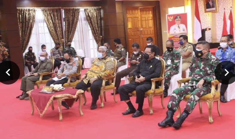 Nampak Gubernur Sulawesi Tenggara (Sultra) Ali Mazi hadir dengan didampingi sejumlah anggota Forkopimda dan sejumlah anggota Satgas Covid-19 Sultra serta kepala OPD di Rumah Jabatan Gubernur.