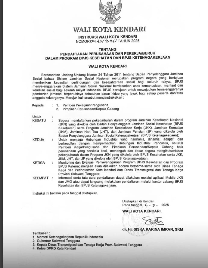 Kendari, Sultrademo.co — Dalam upaya memperkuat perlindungan sosial bagi tenaga kerja di Kota Kendari, Wali Kota Kendari dr. Hj. Siska Karina Imran, SKM menginstruksikan seluruh pemberi kerja, pengusaha, dan pimpinan perusahaan untuk segera mendaftarkan seluruh pekerja atau buruh dalam program BPJS Kesehatan dan BPJS Ketenagakerjaan.