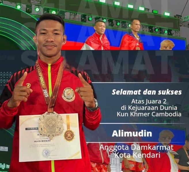 Kendari, Sultrademo.co – Nama Kota Kendari kembali mencuat di ajang internasional. Seorang personel Dinas Pemadam Kebakaran dan Penyelamatan (Damkarmat) Kota Kendari, Alimudin, meraih medali perak pada ajang 6th Kun Khmer World Championship yang digelar di Sihanoukville, Provinsi Preah Sihanouk, Kamboja, Februari 2026.