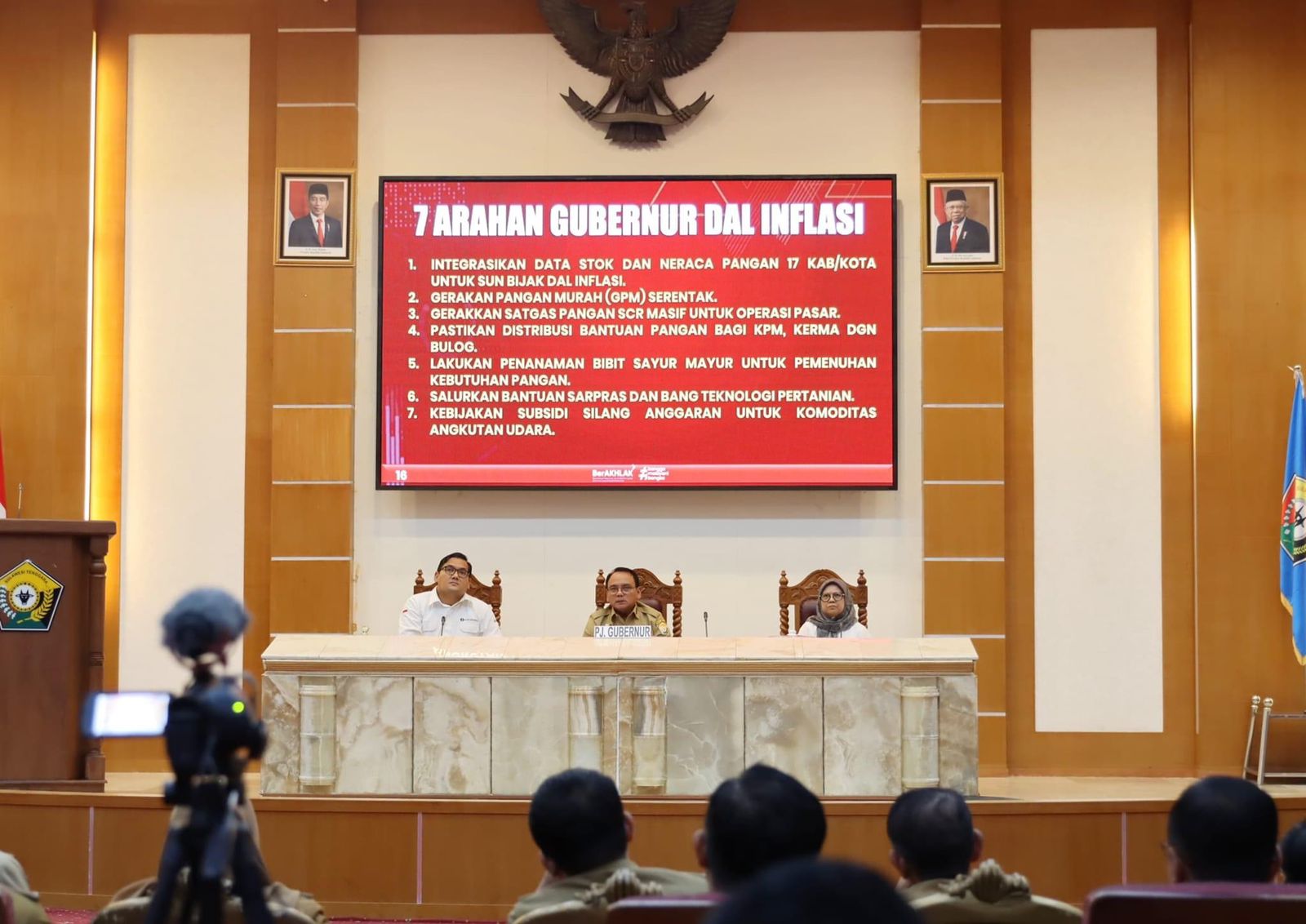 Adapun 7 arahan Gubernur dalam inflasi yakni Pertama integrasikan data stok dan neraca pangan 17 Kab/Kota untuk menyusun kebijakan pengendalian inflasi, Kedua gerakan pangan murah serentak, Ketiga gerakan satgas pangan SCR masif untuk operasi pasar, Keempat pastikan distribusi bantuan pangan bagi KPM dan kerjasama dengan Bulog, Kelima lakukan penanaman bibit sayur mayor untuk pemenuhan kebutuhan pangan, Keenam salurkan bantuan sarana prasarana dan bang teknologi pertanian, Ketujuh kebijakan subsidi silang anggaran untuk komoditas angkutan udara.