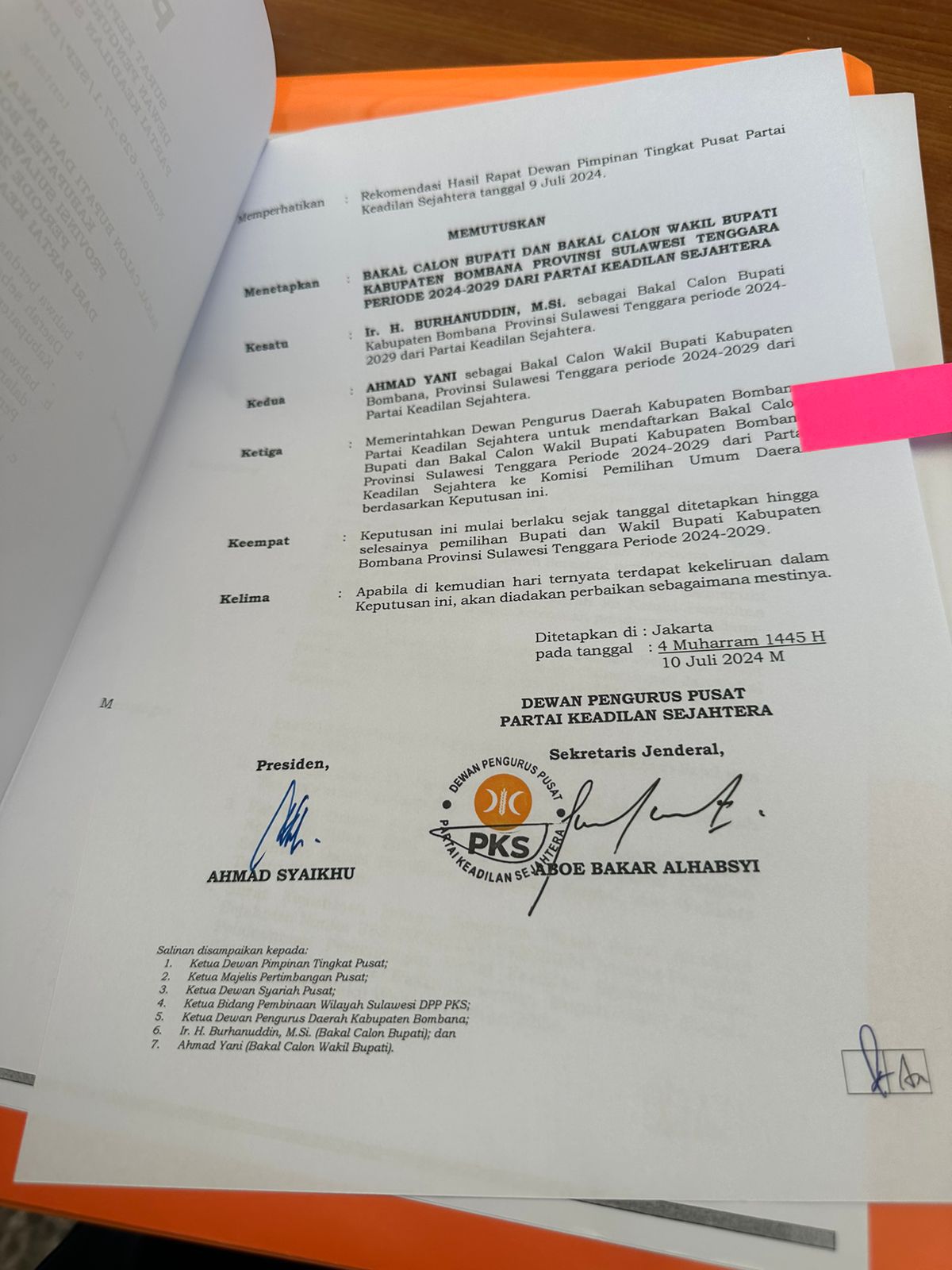 “Memutuskan bakal calon bupati dan wakil bupati Kabupaten Bombana Provinsi Sulawesi Tenggara periode 2024-2029 dari Partai Keadilan Sejahtera,” isi Surat Keputusan itu, yang diperoleh media ini dari sumber internal, Jumat (26/7/2024).