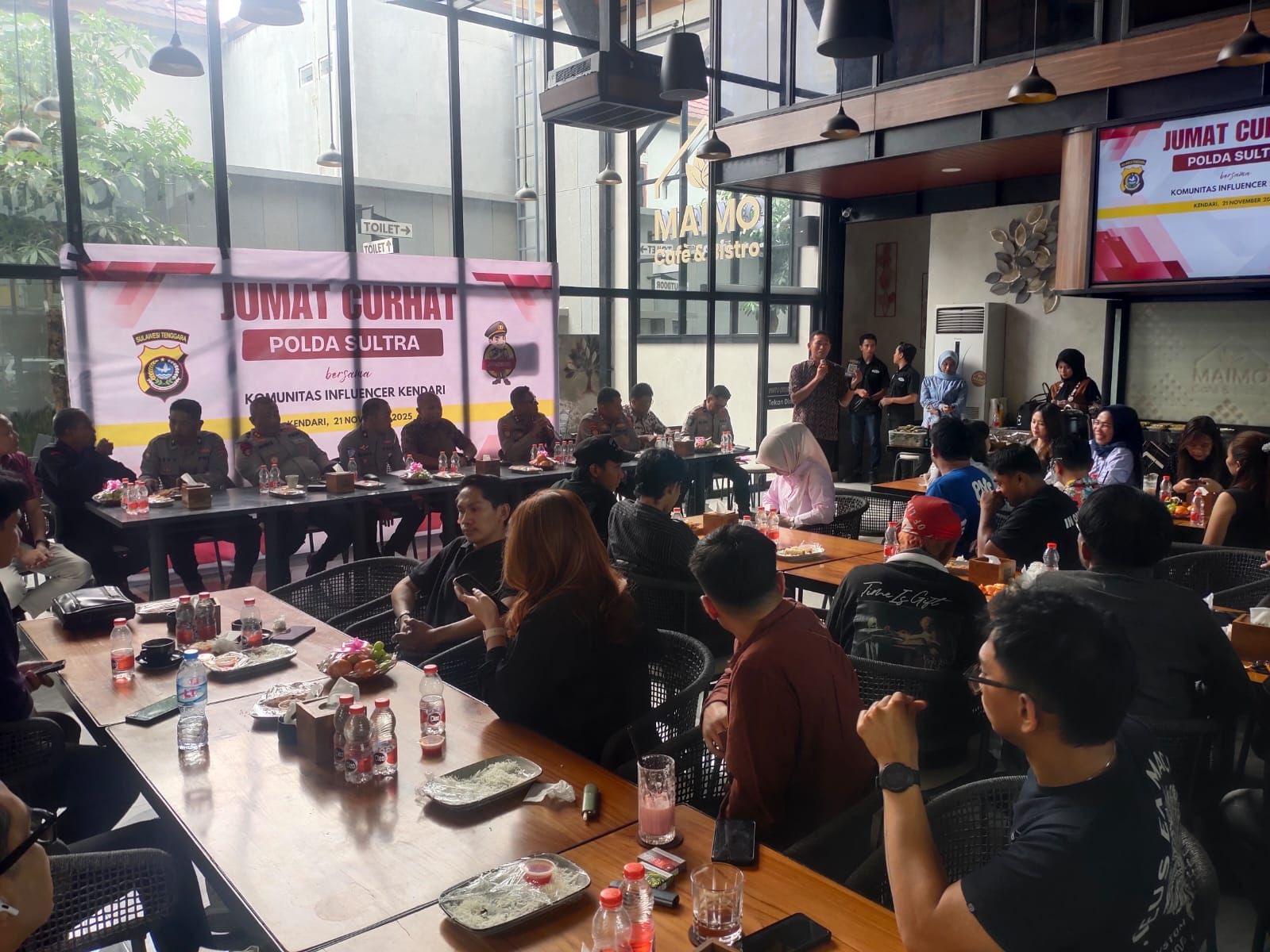 Kendari, Sultrademo.co – Direktorat Reserse Kriminal Khusus (Ditreskrimsus) Polda Sulawesi Tenggara melaksanakan kegiatan Jumat Curhat yang kali ini melibatkan para influencer dari berbagai komunitas di Kota Kendari. Acara tersebut digelar di Maimo Cafe and Bistro pada Jumat (21/11/2025), dipimpin oleh Wadir Krimsus AKBP Dr. Didik Erfianto, serta dihadiri sejumlah pejabat utama Polda Sultra.