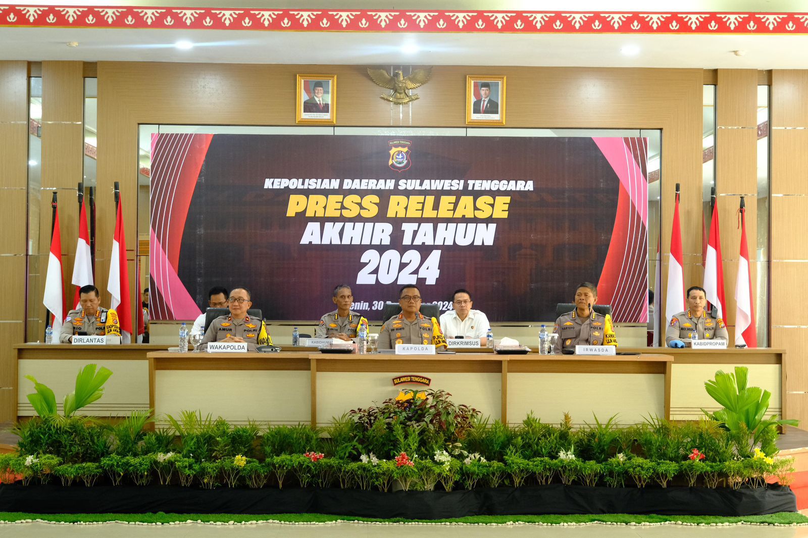 Kendari, Sultrademo.co — Kepolisian Daerah (Polda) Sulawesi Tenggara (Sultra) menggelar Press Release Akhir Tahun di Aula Dachara Polda Sultra, Senin (30/12/2024). Dalam kegiatan ini, Kapolda Sultra Irjen Pol Dwi Irianto memaparkan berbagai pencapaian dan tantangan selama tahun 2024, termasuk fokus pada agenda nasional seperti Pemilu dan Pilkada serentak.
