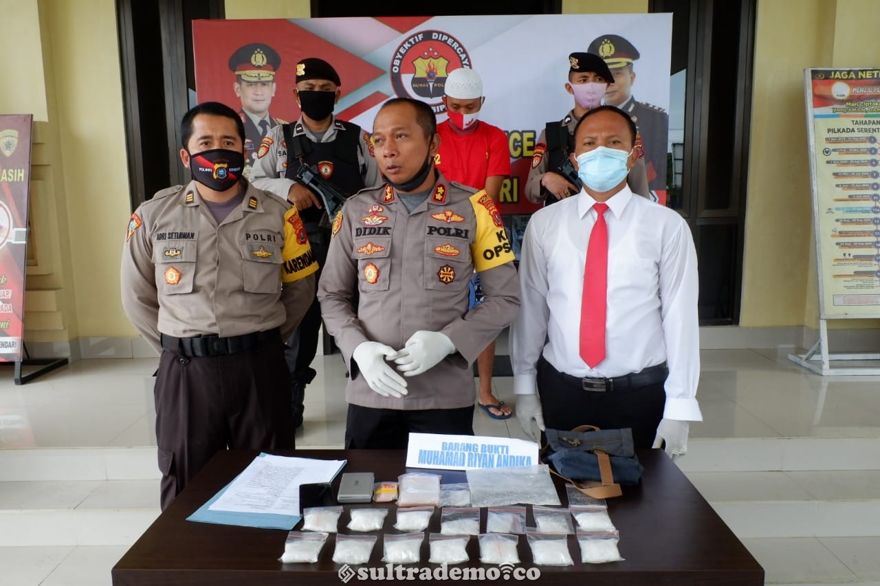 “Kemudian pada hari Sabtu tanggal 04 Juli 2020 sekitar pukul 20.00 wita Tim Opsnal Sat ResNarkoba Polres Kendari langsung melakukan penangkapan dan penggeledahan terhadap target Muhammad Riyan Andika di rumahnya,”ungkapnya saat Konferensi Pers, Senin (6/7/2020)
