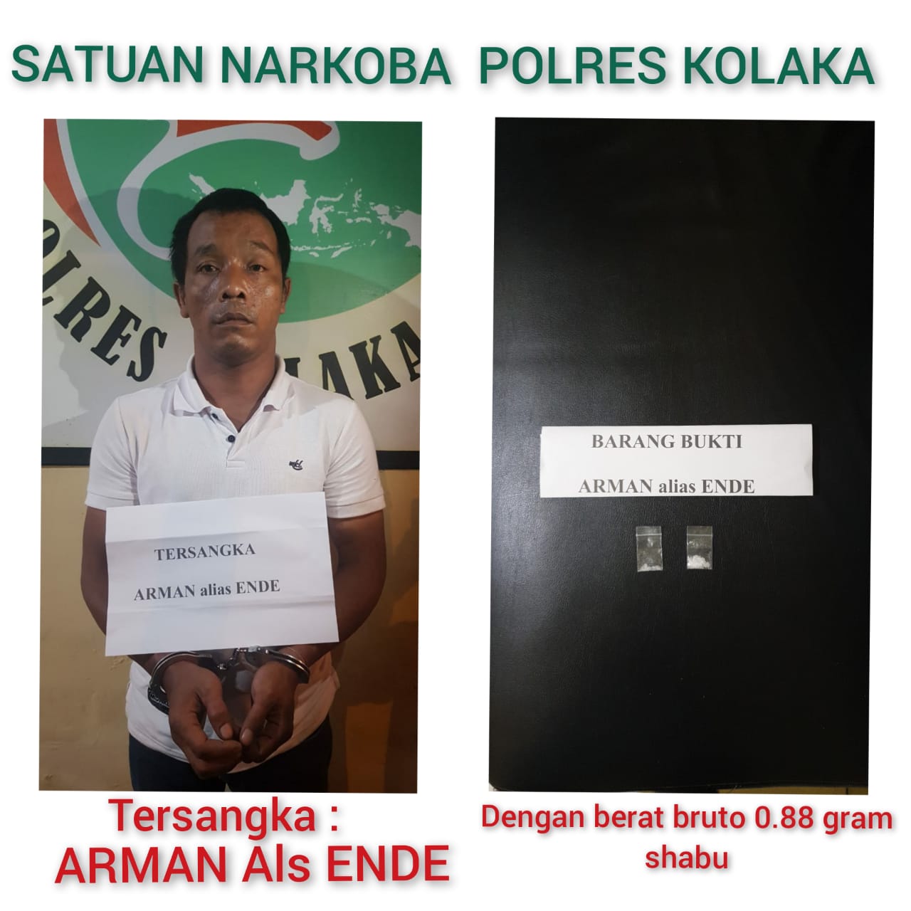 Kasat Narkoba Iptu Muh Alwi Akbar SH MH melalui Paur Humas Polres k2olaka Bripka Riswandi mengatakan, pada hari Jumat (22/1/2021) sekitar pukul 22.00 wita di jalan kali baru No.65 Kelurahan Tonggoni Kecamatan Pomalaa Kabupaten Kolaka telah diamankan suadara (A) Als (E) Bin (HM. Yang bersangkutan ditemukan memiliki, menguasai atau menyimpan barang yg diduga narkotika jenis sabu.