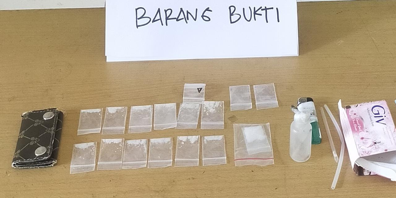 “Ketika penggeledahan, ditemukan barang bukti diduga narkotika jenis shabu dengan berat bruto 0,28 yang diselipkan didalam lingkar celana. Hasil interogasi ternyata pelaku masih memiliki narkotika lainnya di rumahnya. Kemudian personil Sat Resnarkoba melanjutkan penggeledahan di rumah pelaku, didalam kamar ditemukan 1 buah dompet warna coklat berisikan 13 sachet kristal bening dengan bruto 4,84,” jelas Ipda Ramlan.