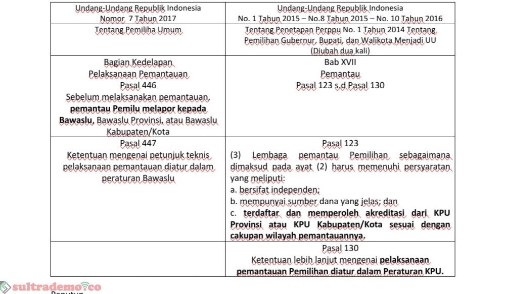 Adapun posisi hukum pemantauan Pemilu dalam pilkada pengaturannya dapat kita lihat pada matriks perbandingan berikut ini: