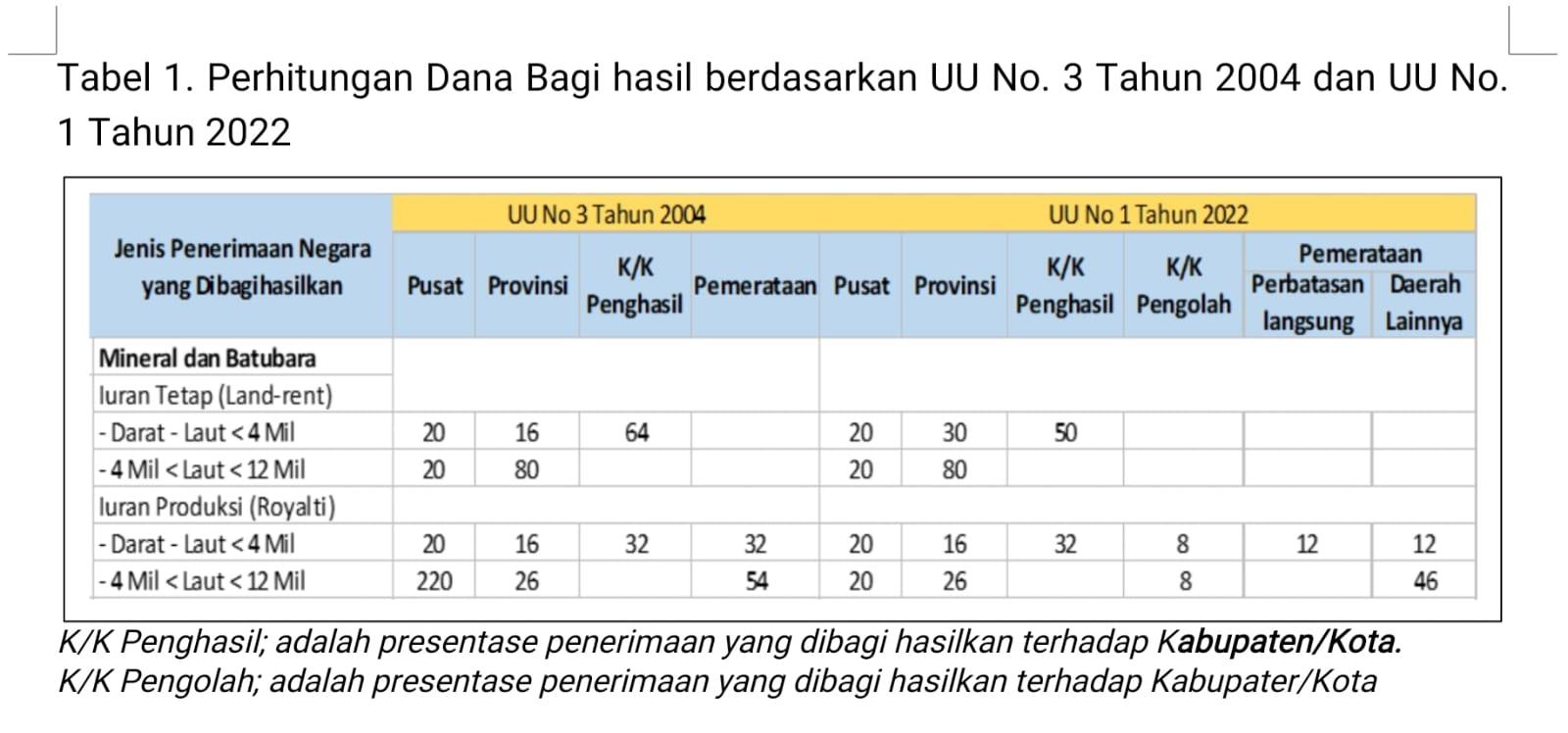 Tabel 1. Perhitungan Dana Bagi hasil berdasarkan UU No. 3 Tahun 2004 dan UU No. 1 Tahun 2022