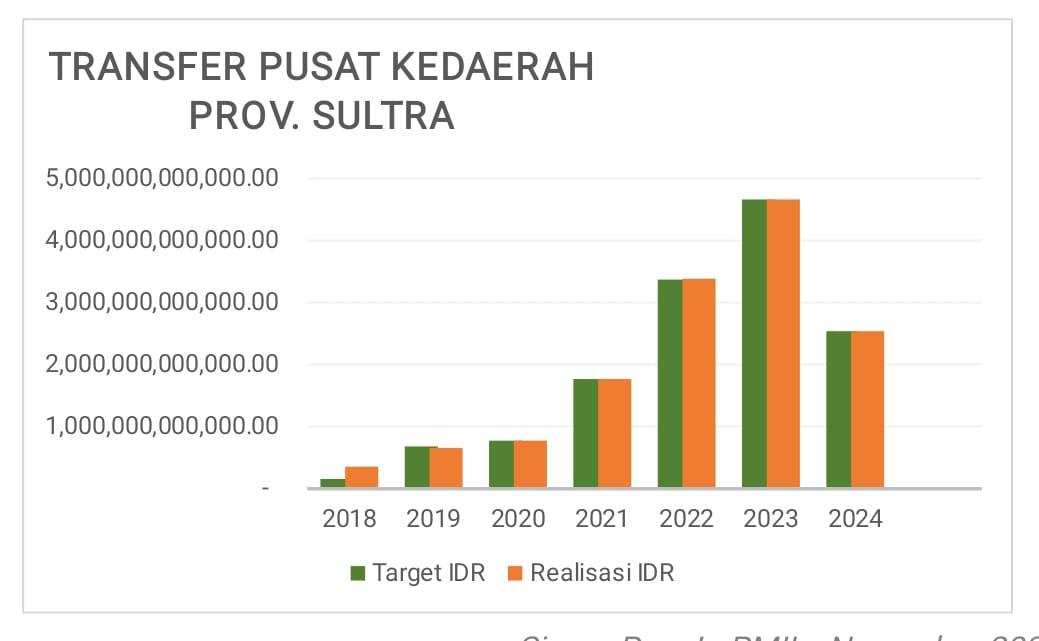 Transfer pusat kedaerah sektor sumber daya alam (nikel) untuk wilayah provinsi Sulawesi Tenggara dalam 7 tahun terakhir mengalami kenaikan rata-rata 54,53%. Berikut uraian pertumbuhan TKDD provinsi Sulawesi Tenggara sejak tahun 2018 hingga tahun 2023 melonjak signifikan. Pada tahun 2019 mengalami kenaikan dari tahun 2018 sebesar 84,99% atau mencapai 655.250.000.000,00 dari yang sebelumnya hanya berada pada posisi 354.200.000.000,00. Pada tahun 2020 Kenaikan melemah hanya berkisar 18,13% dengan realisasi transfer sebesar 774.070.000.000,00. Pada tahun 2021 kenaikan fantastis terjadi mencapai 128,36% atau dengan jumlah transfer mencapai 1.767.650.000.000,00 dari transfer tahun sebelumnya. Lalu pada tahun 2022 kenaikan terus terjadi dengan presentase 91,49% atau sama dengan 3.384.830.000.000,00. Lalu ditahun 2023 kenaikan Kembali melemah dengan kisaran 37,75% dengan realisasi transfer 4.662.590.000.000,00. Ditahun 2024 hingga tahun 2025 adalah masa transisi dimana Indonesia sedang menghadapi proses pemilihan umum secara serentak dari pusat hingga ke daerah. Situasi ini sangat berdampak pada posisi keuangan negara demikian pula transfer DBH dari pusat kedaerah ditambah lagi keluarnya kebijakan keuangan untuk melakukan efesiensi TKDD hingga pada akhirnya transfer mengalami penurunan yang cukup signifikan dari tahun sebelum menjadi minus (-45, 54%) atau senilai 2.539.200.000.000,00