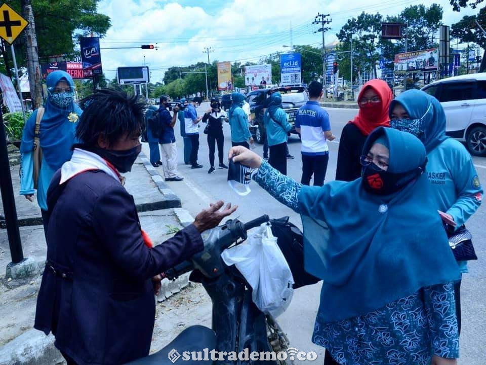 Kendari, Sultrademo.co – Ketua Tim Penggerak PKK Kota Kendari Hj. Sri Lestari, S.Pd, M.Si bersama Ketua TP PKK Provinsi Sultra Agista Ariany, SE dan anggota TP PKK Kota Kendari membagikan masker secara langsung di area Car Freeday Kota Kendari bertepatan dengan puncak perayaan HUT Kemerdekaan RI yang ke 75. Senin, 17/08/2020.