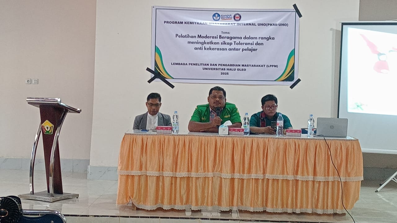 Saninuh menyampaikan hal tersebut dalam kegiatan yang digelar Lembaga Penelitian dan Pengabdian Masyarakat (LPPM) melalui Program Kemitraan Masyarakat Internal Universitas Halu Oleo (PKMI-UHO), yang mengusung tema “Pelatihan Moderasi Beragama dalam Rangka Meningkatkan Sikap Toleransi dan Anti Kekerasan Antar Pelajar”, yang berlangsung di Aula Museum Sulawesi Tenggara, Sabtu (25/10/2025).