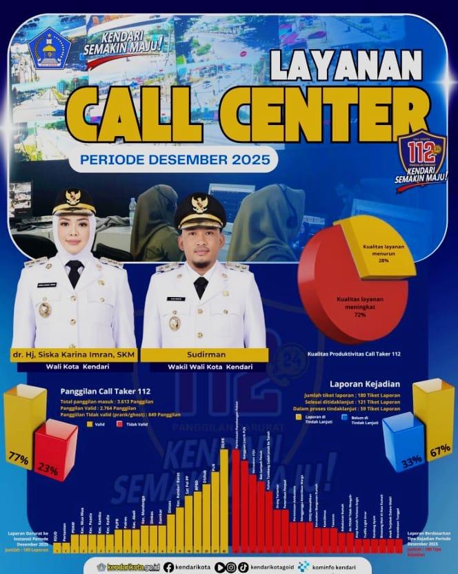 Kendari, Sultrademo.co – Ribuan warga Kota Kendari memanfaatkan layanan Call Center 112 sepanjang Desember 2025 untuk melaporkan berbagai persoalan darurat hingga layanan publik. Dalam kurun waktu 1–31 Desember 2025, layanan yang dikelola Dinas Komunikasi dan Informatika (Kominfo) Kota Kendari ini menerima total 3.613 panggilan dari masyarakat.
