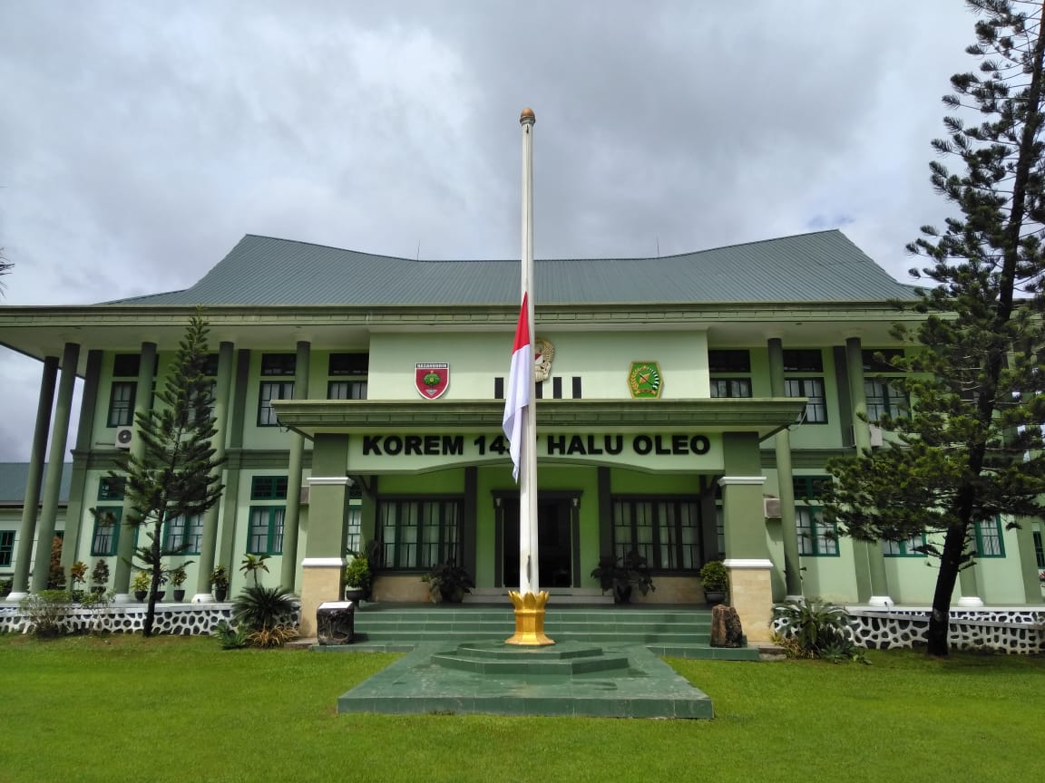 KENDARI, SULTRADEMO. CO – Sang Saka Benderah Merah Putih nampak berkibar setengah tiang di Halaman Komando Resor Militer (Korem) 143/Halu Oleo Kendari, Rabu 12/6/2019. Benderah merah putih itu sengaja dikibarkan sejak tadi pagi.
